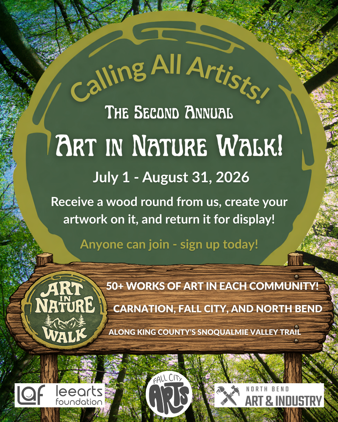 The Art in Nature Walk is an outdoor art gallery that transforms ordinary wood rounds into unique works of art along the Snoqualmie Valley Trail in Carnation, Fall City, and North Bend. The project brings local artists and the community together, creating a family-friendly experience where art meets nature.