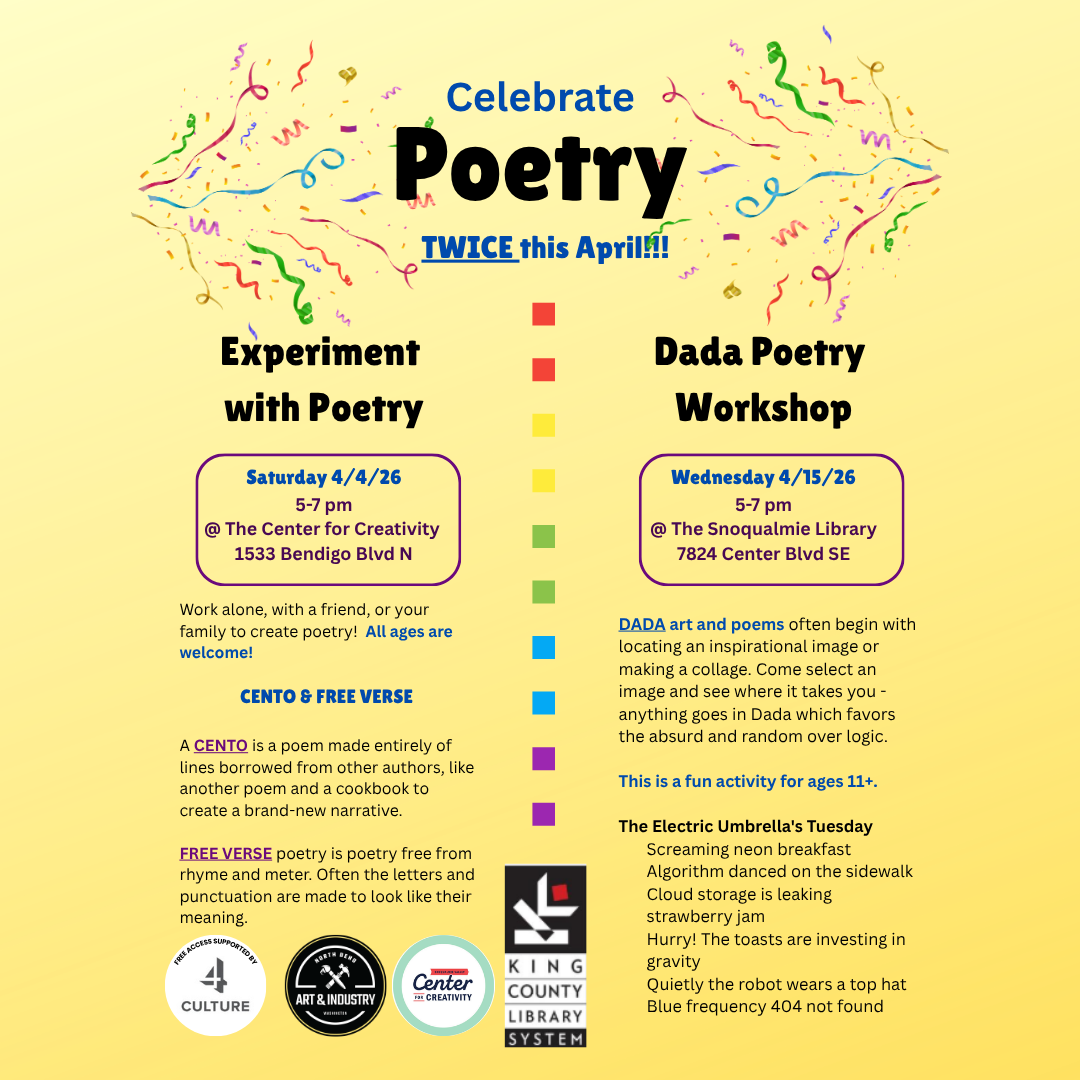 April is Poetry Month!!!! And a great time to try your hand at it, or renew your love for it. We have 2 events planned. JOIN US!! No cost for these eventsNo registration requiredBring your creativity and imagination