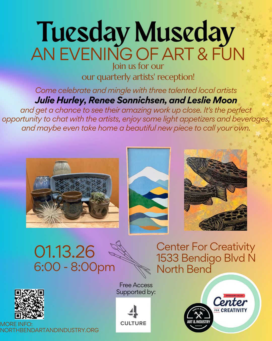 Every three months, NBA&I showcases up to three local artists at the Center for Creativity. AND one special Tuesday during the first month that their work being displayed, we host an Artists Reception “Tuesday Museday!!!”